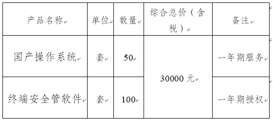 重慶化醫(yī)控股(集團(tuán))公司因工作需要,需購(gòu)買國(guó)產(chǎn)操作系統(tǒng)(一年期服務(wù))軟件50套、終端安全管理系統(tǒng)軟件(一年期授權(quán))100套,誠(chéng)邀貴公司參與該項(xiàng)目競(jìng)爭(zhēng)性談判報(bào)價(jià)。